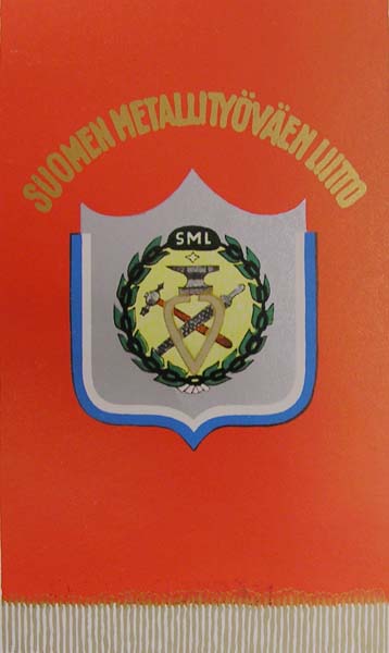 Suomen Metallityöväenliiton lippu pöytäviirinä kuvattuna.