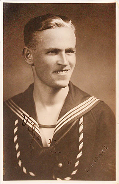 Isä kuvautti itsensä 5.5.1940 laivaston alikersantin asussa. Valokuvaaja E. Rönkkö on retusoinut kasvoja ilmeisen voimakkaasti.